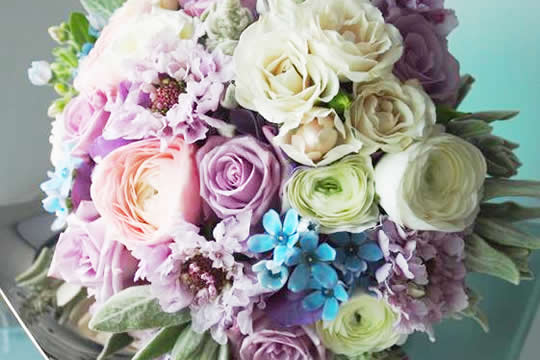 Florence:時尚系的花球於色調上,經常會混合同色系花材,以突顯柔和的女性美。不過,有時亦會混合顏色對比較大的花材,營造出愉快活潑的感覺,適合舉行戶外婚禮的年輕新娘子。