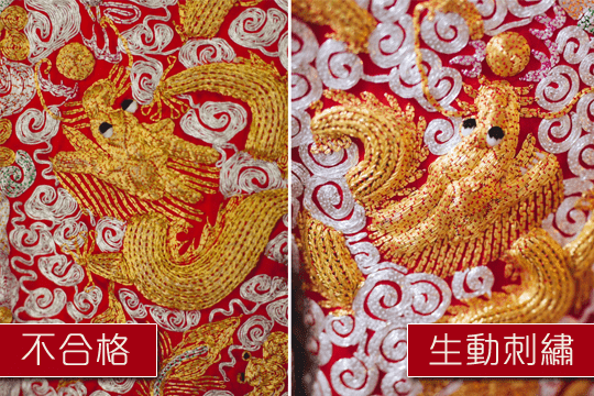 傳統正宗龍鳳褂后刺繡密度要高達90%,不只著眼於刺繡密度,更重要留意的是所有龍鳳都需要採用全立體的卜心繡法,整件褂后上需有立體的龍柱繡綴於上衣拉揀的正中,袖口、衣腳及裙邊均繡滿了成雙成對的立體龍鳳,先稱得上真正褂后!
