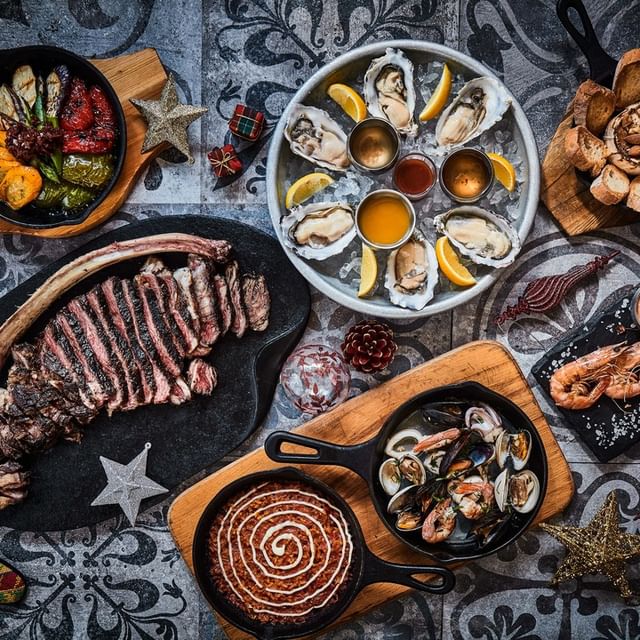 位於銅鑼灣V Point頂層的ALTO Bar & Grill,除了能欣賞到維港景致外,還主打呈現傳統的聖誕風味,今年聖誕限定晚市套餐中,就有鮮甜的英國Morecambe Bay 生蠔配青蘋果木犀草醬和聖誕節必吃的烤英國火雞片配煙肉香腸卷、蘿蔔及番薯蓉等精美菜單,甜品則是聖誕黃金布甸配香料雪糕!