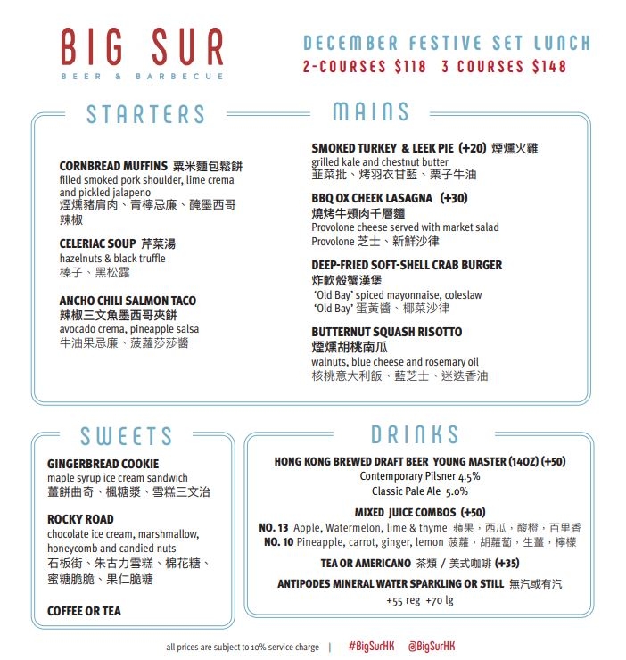 聖誕菜單的主菜選擇有很多,包括:三文魚蟹肉配番茄及辣肉醬、澳洲M5和牛西冷配慢煮牛面頰、牛油煮菠菜配松露汁、油封酥皮榖飼雞腿配糖煮芹菜蘿蔔蓉、椰菜苗及雞肉汁、香煎鱸魚配奶油焗薯及法式龍蝦湯,甜品則是大受歡迎的反烤蘋果撻配焦糖醬及酸忌廉。