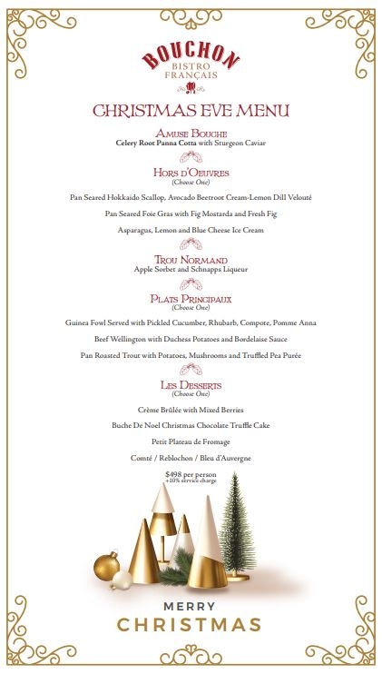 三道菜先以前菜開啓大家的味蕾,包括:Huîtres法國生蠔配上青蔥木犀草醬、Escargots法國勃根地蝸牛配香草及大蒜牛油等款式,主菜則有Bouillabaisse Provençale馬賽魚湯,慢煮虎蝦、青口、鱸魚及蟹、法式經典牛扒幼薯條配滑蛋、選用榖飼牛柳製成傳統牛肉他他,配上香烤法式長麵包等。就連甜品也是為聖誕特別設計的朱古力樹頭蛋糕配雜莓、焦糖燉蛋配配雜莓、Café Gourmand濃縮咖啡配泡芙及朱古力慕絲,加上一杯溫暖的聖誕紅酒,一同迎接美好的聖誕節!