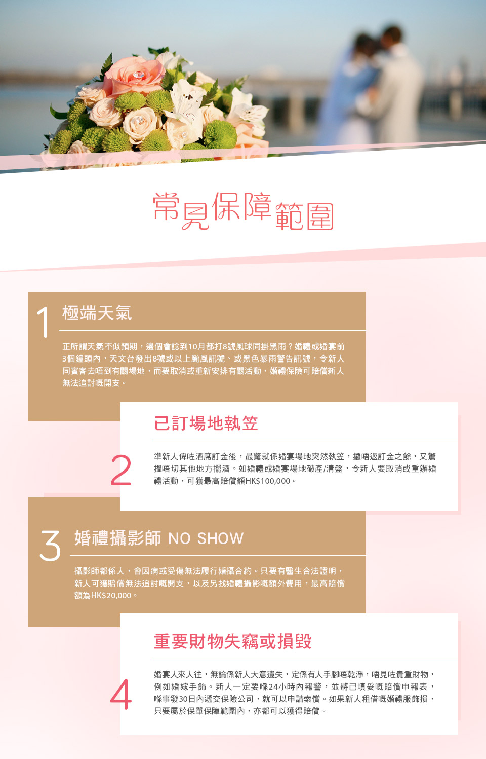 正所謂天氣不似預期,邊個會諗到10月都打8號風球同掛黑雨?婚禮或婚宴前3個鐘頭內,天文台發出8號或以上颱風訊號、或黑色暴雨警告訊號,令新人同賓客去唔到有關場地,而要取消或重新安排有關活動,婚禮保險可賠償新人無法追討嘅開支。