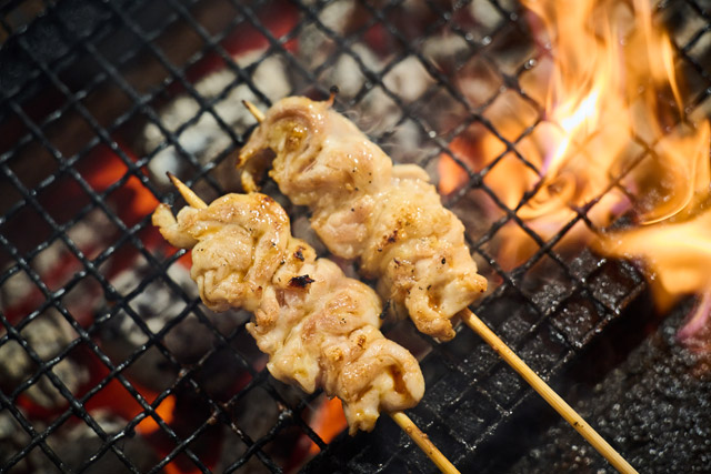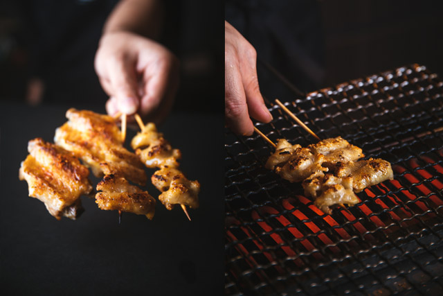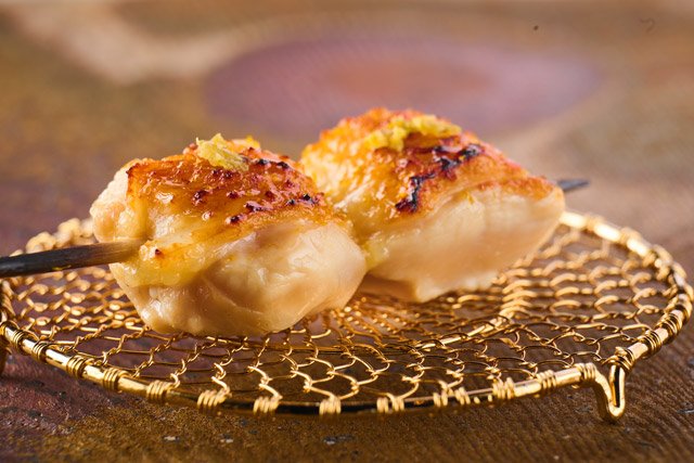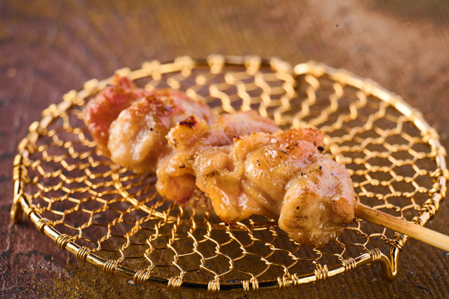 進入燒物部份,主廚會準備當日質素最好的地雞部位,從一般的雞胸、雞髀、雞翅,到橫隔膜肌、雞腎、腰皮、頸肉等,每款雞肉串除了加鹽提鮮外,亦講究醬油的運用,主廚特別從本店帶來十年以上的老醬油膽,當中滲滿雞肉的精華,獨特風味無可取替。對於特別的部位,又會採用泰式魚露、螢光魷魚醬油等海鮮風的調味,相當細緻。