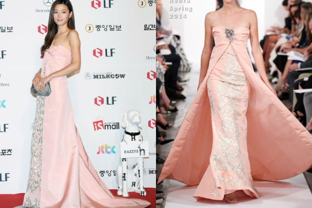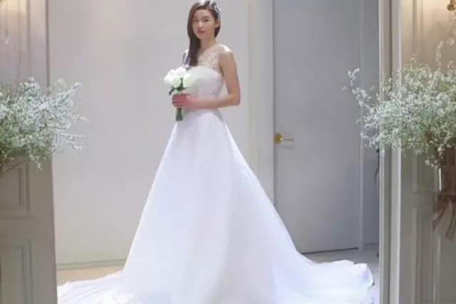 全智賢在韓劇《來自星星的你》內飾演的千頌伊,亦曾穿上 Oscar de la Renta 的 2014 春季婚紗,以簡約純白拖尾設計,配合印有碎花的輕紗,展現典雅的氣質。