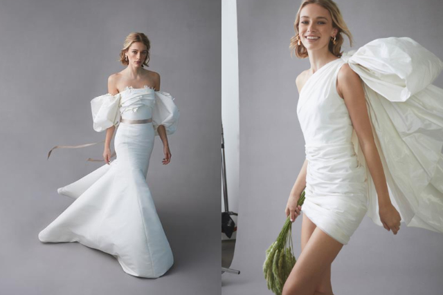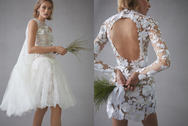 婚紗以立體花瓣刺繡在袖子及胸口位置,並以皺褶塑造腰線,配合傘形短裙設計,打造甜美活力感覺。