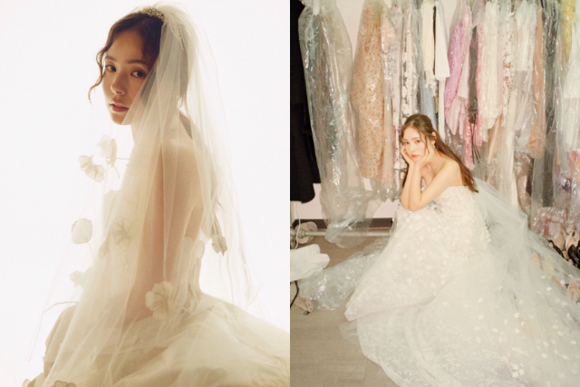 在最先釋出的簡約婚照中可見,朴信惠所穿的抹胸鏤空婚紗是來自有「頂級晚禮服」之稱的美國品牌 Oscar de la Renta;婚紗以傘形裙襬遮住孕肚,鏤空絲帶圖案展現性感,細心一看,就會發現胸口還有一個蝴蝶結,令整體的甜美度上升!朴信惠除了在婚攝時穿上 Oscar de la Renta的婚紗,她亦在大婚當天,穿上品牌的訂制婚紗行禮,據稱價值超過 50 萬港元,亦要是VIP 才能訂製的,果然是名緩最愛婚紗品牌啊!