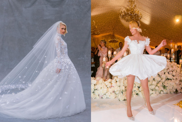 名媛 Paris Hilton 在去年底的夢幻婚禮中,亦是穿上 Oscar de la Renta 的婚紗行禮,並以同一品牌的另一套短婚紗出席舞會,展現出兩個截然不同的風格。