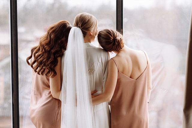 用雙手輕輕托住頭紗的左右邊緣(約在太陽穴位置),靠近攝影師方向的手要擺放得較另一隻手高,別擋著新娘的臉,同時避免直接抓住頭紗中央或髮梳位置,以免拉扯頭髮