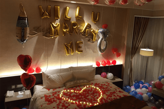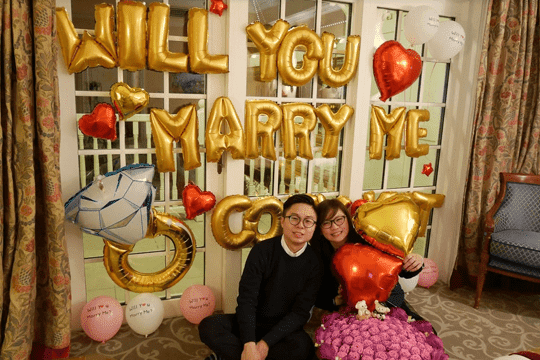 酒店房求婚的必備道具當然少不了氫氣球,其實求婚汽球的款式很多,男士十有八九都會準備粉紅氫氣球充斥整間套房,再在窗邊貼上英文字母氣球拼成的will you marry me/I love you字句,將房間填滿汽球的畫面絕對是童話式的浪漫求婚,不過同時就要找不少朋友幫忙「吹波」了!