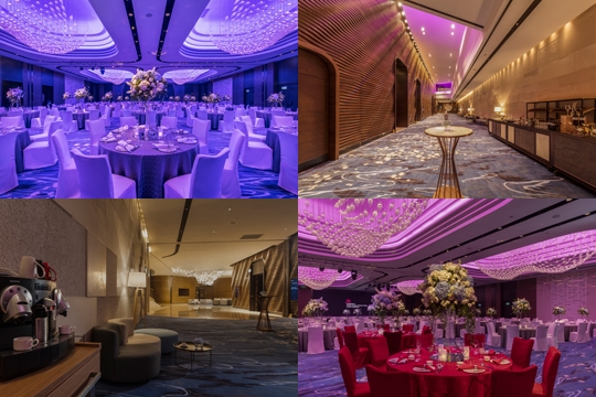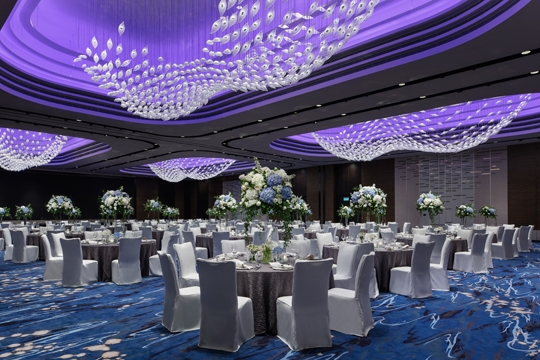 以海洋為主題的無柱位大型宴會廳,7米的高樓底設計,空間感十足,天花吊燈以小魚群作設計靈感,特別之餘又切合海洋主題。宴會廳面積達1200平方米,能夠筵開80席,適合想大宴親朋的新人。想擺小型婚宴?當然無問題,宴會廳可分拆為不同大小的場地,間隔靈活,讓新人更有更彈性的選擇。