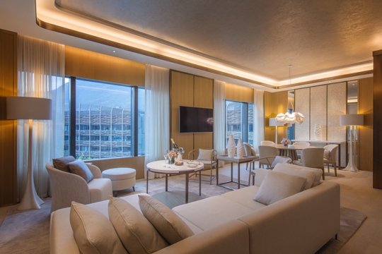 酒店會有專業的活動統籌團隊為新人度身訂造每個婚禮細節,由場地、裝飾、餐具,以至菜單,團隊也會替新人安排妥當。蜜月套房空間寬敞,採用柔和的米白色為主調,配以簡約現代風格,新人更可於蜜月套房內享用的兩人份香檳早餐,perfect!