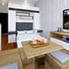 由於單位天花原有3條橫樑,為客廳減輕壓迫感,設計師以木條子作裝飾,屋企即刻好有style! 屋主又購入一張靈活多變嘅梳化床,日間可以擺返個茶几,夜晚打開就變成雙人床。