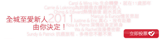 2011全城至愛新人最後8強 04 July,2011 因為愛,令彼此圓滿 編輯每次跟一對新人訪問時,不知不覺成為了他們的好友,在短時間回顧他們的愛情,見證二人如何一路走來, 每次也為他們的喜悅而欣喜、為他們籌備婚禮而著急… 2011全城至愛新人大賞的每篇愛情故事,我們都看過,每看一次都感動一次, 8個感動人心的愛情故事,成就了「至愛」新人最後8強, 在此感謝全城新人熱烈參與, 是您們的故事,讓人們知道,時間讓感情沉澱、昇華,再孕育出二人共同的道路,讓我們一起細味8對新人不同的愛情故事。