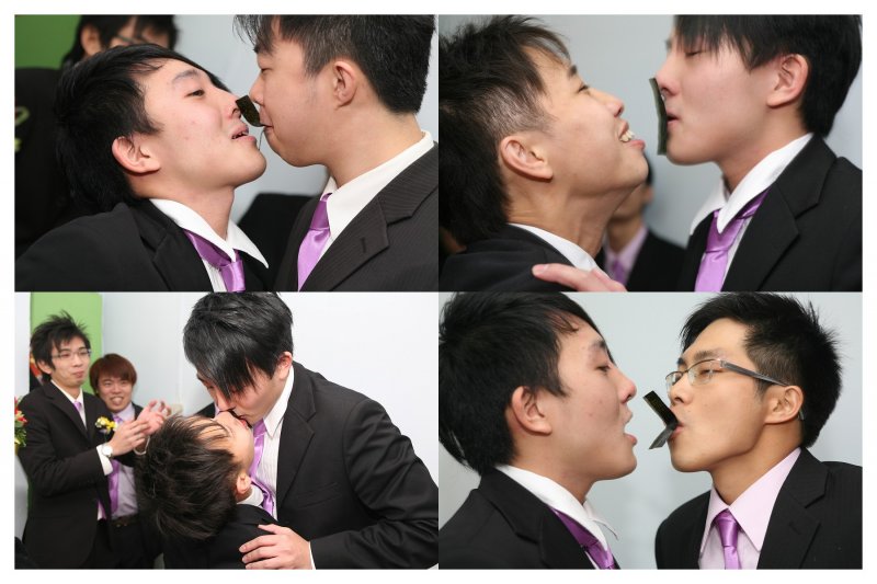 蜜蜜kiss 01 November,2009 道具:紫菜(越細張越搞笑) 請兄弟列成一行(最好高矮高矮隔住排),兄弟需要用口傳紫菜,由第一位傳到最尾。 雖然遊戲好簡單,但過程極級搞笑,睇住d兄弟既好喉「琴」要kiss既表情、紫菜被口水弄到又濕又爛、黏實個嘴、高既兄弟又要同矮既兄弟「就」位,最緊要係睇相同睇片時,個個笑到碌地 話哂係game~最重要係人人歡喜^^