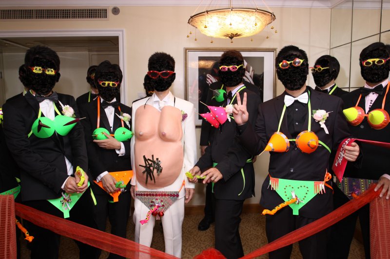 當新郎及兄弟團準備入屋前, 便要求他們穿上, 姊妹團協助新郎哥及眾兄弟穿上。先蒙著數位兄弟雙眼,姊妹團把花生香蕉醬塗在新郎哥及其餘兄弟已穿上三角褲之蛇頭上。在限定時間內, 蒙眼兄弟要把所有醬料舔去,超時的話,來個大懲罰!