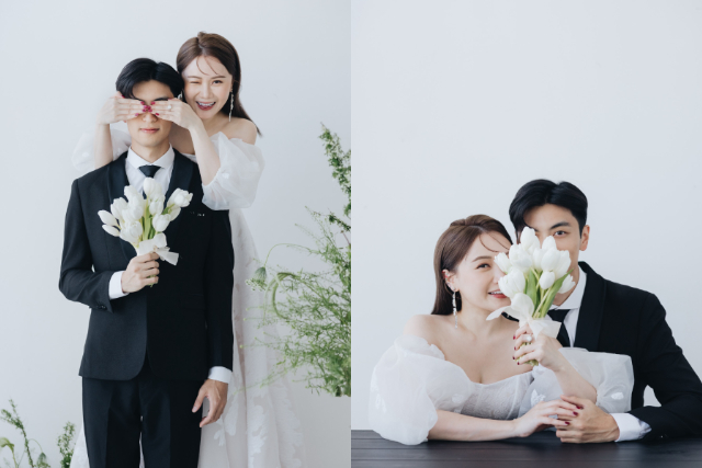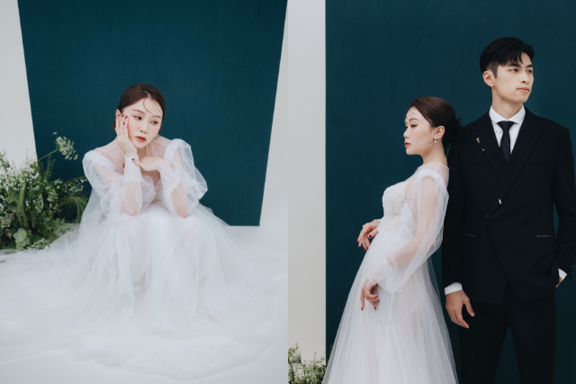 Hana就特別喜歡深藍色背景的這一套照片,她覺得整張婚紗照的構圖簡簡單單,用顏色層次突出主體,有一種淡淡的高級感。