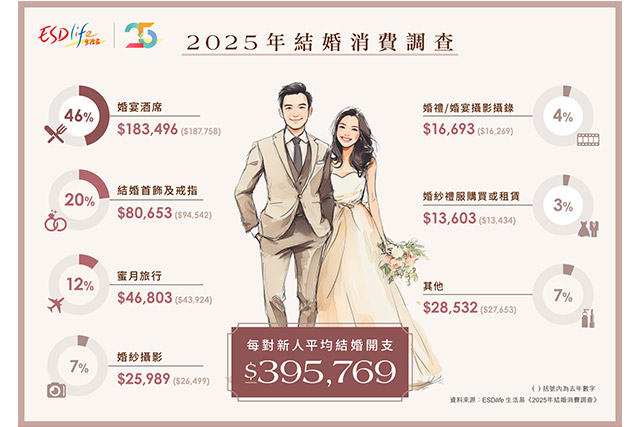 結婚消費調查顯示,2025新人結婚平均開支微跌3%至港幣$395,769。此數字反映,新人在經濟氣氛未明朗下更重視預算管理,令數項婚禮支出均見下調現象。