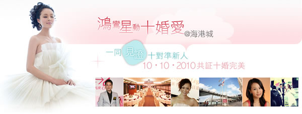 由鴻星集團及海港城聯合舉辦的「鴻鸞星動十婚愛@海港城」活動即將於今個星期日 (2010年10月10日) 展開,十對較早前入圍的準新人將於這百年難得一遇的日子,一同在海港城舉行集體婚禮,同時攜手宣揚綠色婚宴,以及肩負生「兔仔」的使命。