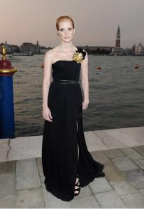 另一位最佳晚裝示範是Jessica Chastain,是晚Jessica在娜姐手中接過Gucci Award的殊榮,表現得相當興奮。當晚她同樣以一襲黑色長裙出席典禮,不同的是,她的晚裝相當女性化,充滿了優雅的感覺,下擺的高叉盡顯雙腿美態;one-shoulder款式突出了肩膊的美感,最讚是其上的一朵金花,為整套黑色晚裝起了「點睛」的效果,非常搶眼﹗