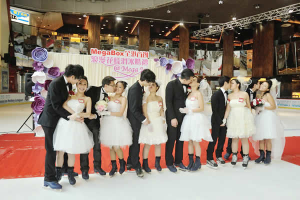 上週四白色情人節,傳統習俗男方會送禮物向心儀的女孩表達愛意。不過,除送禮之外,有甚麼會好得過在這特別的一天向對方許下永生相依的終身承諾?而在白色情人節當日,相信亦沒有甚麼場地會比在白矇矇的冰雪上交換婚戒更應景、更難忘!有見及此,MegaBox於白色情人節當日於Mega Ice滑冰場上首次舉行「創浪漫花樣滑冰婚禮」,於一片浪漫的冰地上見證六對戀人許下「無論是順境或是逆境,無論富有或貧窮,無論健康或疾病,都對對方不離不棄」的誓詞。花樣滑冰婚禮準時開始,一對花式滑冰小情侶以優雅的舞姿為「全港首創浪漫花樣滑冰婚禮@Mega Ice」揭開序幕。一對小情人在浪漫醉人的音樂下做出多個高難度動作,例如跳躍、旋轉等,將優美姿態表露無遺,令現場觀眾如癡如醉。一輪精彩的花式溜冰表演後,六對穿上華麗婚紗及筆挺禮服的準新人手牽手甜蜜在冰上滑翔出現,並進行一個簡單而隆重的模擬婚禮,準新人們同心合意宣讀誓詞、交換戒指,並且完成情深一吻,讓眾人見證段段刻骨銘心、海誓山盟的愛情故事。