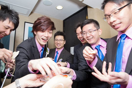 4. 正所謂「一支竹仔易折彎,幾支竹仔斷折難」。除新郎哥之外,如果兄弟們肯齊心合力共同作戰,也肯講義氣,代新郎哥接受各項挑戰人體極限的遊戲,為兄弟兩脥插刀在所不計,相信姊妹們都會為這份俠義之情而動容。
