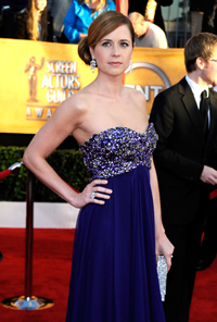 至於Jenna Fischer則以露肩的深藍色晚裝上陣,本身她的晚裝已有相當多的閃石,因此她沒有配戴誇張的飾物,沒有配戴頸鏈以免跟晚裝的閃石「相撞」,避免了Over bling的效果。她配戴的是一對精緻形鑽石花式垂吊式白金耳環及欖尖形白金鑽石戒指,加上簡單討好的髮型,整個形象優雅、高貴。 | |