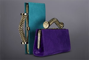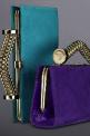 1. 天鵝絨質地的的Evening clutch,以金色的金屬手挽為點綴,備有湖水綠及紫藍兩色,線條簡單,優雅大方。