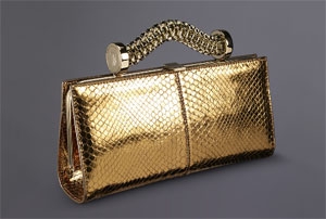2. 金色仿蛇紋的clutch,質地挺身,同樣以金色的手挽作為品牌的特色。