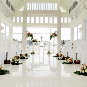 海外婚禮近年相當流行,熱門的行禮地點包括有峇里、沖繩、北海道、關島等等,除了這些熱門的地點外,位於泰國布吉的一個小島Laguna亦同樣擁有白色的小教堂,藍天碧海,彷如人間天堂。Laguna環境極為優美,緊貼著熱帶的河川湖畔,有完善的渡假設施,小教堂的屋頂以傳統泰式建築設計,以落地大玻璃為牆身,陽光輕照進來,新人可以透過敞大的玻璃欣賞360度的自然景觀,在水清沙幼、海天一色的美景下許下婚盟,令人畢生難忘。