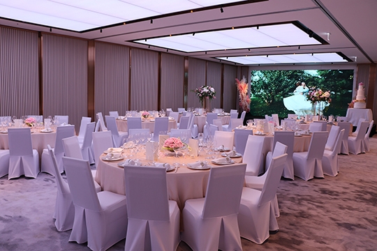 宴會廳內設置大型LED幕牆,不論身處何處都能無遮擋觀賞新人的幸福瞬間。宴會廳與大堂緊密相連的迴旋雲石階梯,以簡約白色拱門搭配層層雪紡裝飾,營造出高雅又充滿時尚感的婚宴氛圍。此外,宴會廳舞台後設有一個獨立的房間連洗手間,可供婚宴的新娘子作新娘房之用。