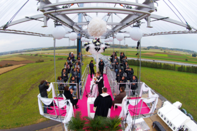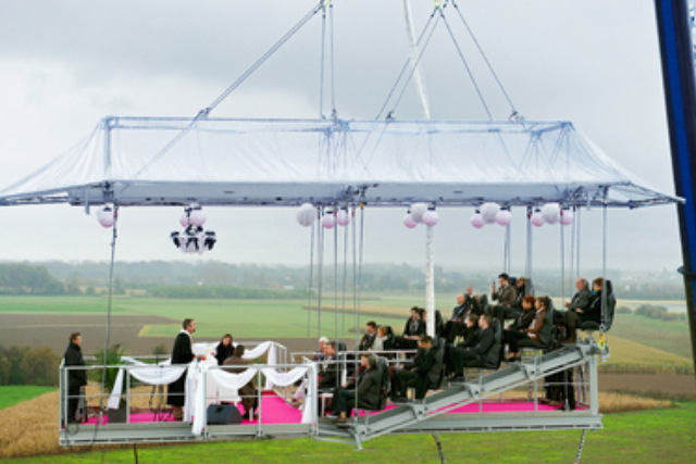 想在空中舉辦婚禮?比利時公司Dinner in the sky 就推出了「空中婚禮」,為情侶們提供了像在教堂裏一樣的婚禮,有牧師、證婚人、家人和朋友,在離地面50公尺的高空中舉辦甜蜜浪漫的極限婚禮。