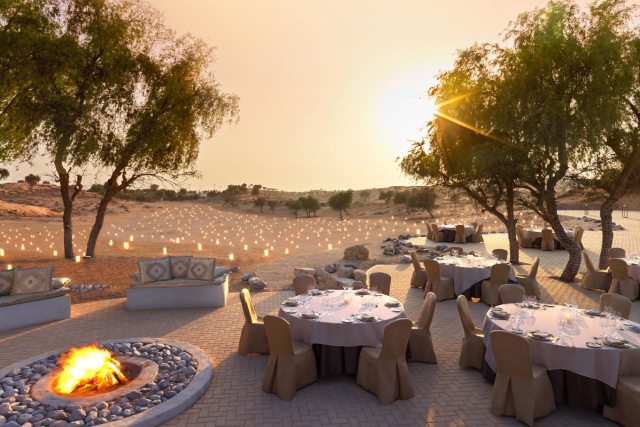 晚上的時候,沙漠中還會燃起內置的火坑,就像是為沙漠增添點點星光,特別浪漫夢幻。準新人和來賓們可以在阿拉伯充滿異國風情的音樂下翩翩起舞,又或者在帳篷内享用豐盛宴會,締造永生難忘的浪漫回憶。