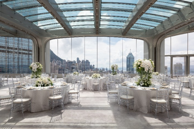 説到香港最新的奢華婚宴場地,就一定不能不提The Henderson的Cloud 39,也是全港最高的全玻璃天幕宴會廳。Cloud 39擁有6800平方呎的無柱宴會空間,最多可容納400位賓客。宴會廳採用寬敞明亮的落地玻璃設計,坐擁270度的城市天際線繁華景觀,讓新人在壯麗景色中許下一生承諾。此外,Cloud 39還設有戶外露台,適合舉辦席前酒會和席間茶歇小休。