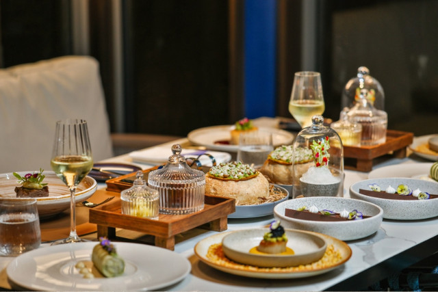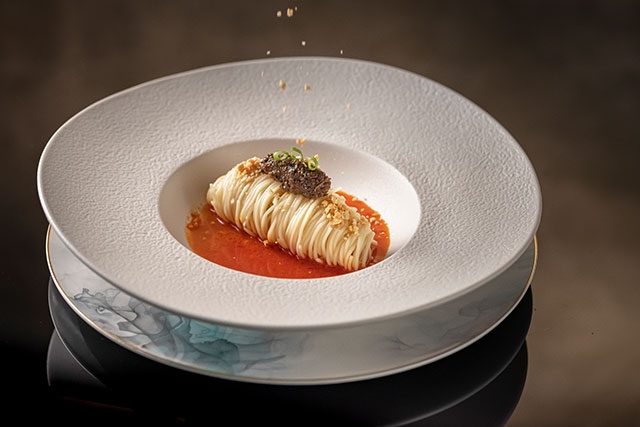 壓軸登場的是烈焰竹炭和牛肋肉,搭配竹炭,煙燻香氣與現代演繹交織成大膽戲劇化的主菜。天府擔擔麵延續此章節,將經典川味精緻呈現。尾聲則由茉莉花生酪和酥皮雪燕杏仁蛋撻劃下圓滿句點,為整場餐飲體驗締造感官上最美好的收結。