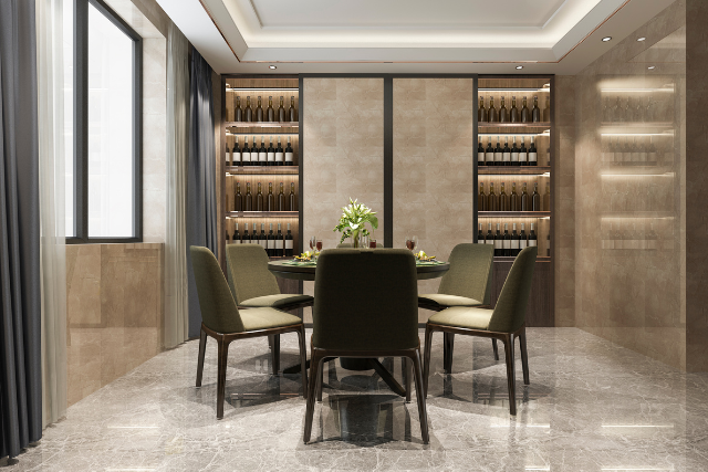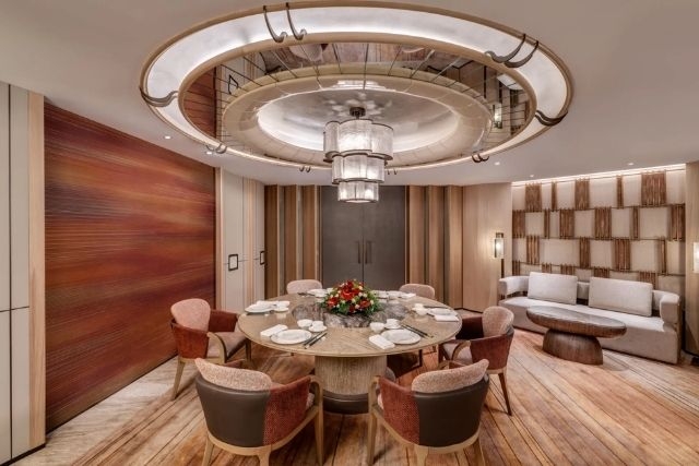 貴賓廳設計取材於一天裡兩個重要時刻 ─ 日出和日落。右方的貴賓廳,在柔和的橙色和金色陶土的牆紙上,飾上手繪線條,捕捉晨曦的光輝,私密氛圍中充溢著一天的盼