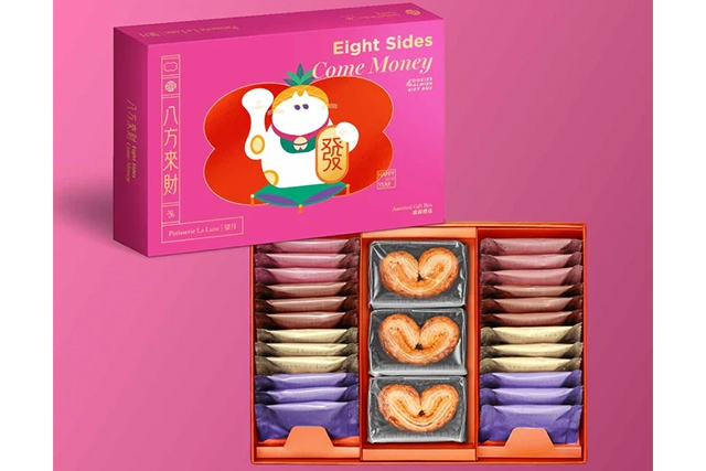 福瑞如意的八角形朱紅色禮盒有着富貴吉祥的意思,盒面鋪繪着對稱有序的窗花剪影圖紋,福盒內包羅萬有,12款蝴蝶酥口味一應俱全,選用日本高級原材料製成,牛油香氣濃郁、口感酥脆,滿載誠意的送禮之選,作為拜年款客的零食亦十分相宜。