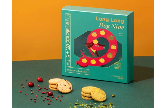 以活潑長身狗狗作包裝,象徵關係長長久久。禮盒盛載開心果曲奇(9件)及紅莓曲奇(9件),天然堅果及莓果味道突出,同時散發濃郁牛油香氣,口感香脆鬆化,滿足味蕾多層次的追求。