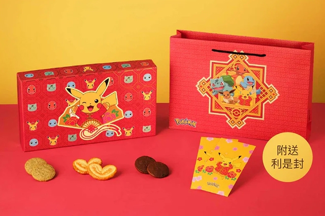 盒上讓人驚喜的Pokémon,換上喜慶紅色唐裝,從中式摺扇鑽出來跟大家拜年。盒內的經典蝴蝶酥及伯爵、伯爵曲奇、朱古力曲奇味道俱全,讓人盡嚐三款截然不同的口味,加上隨禮盒附送喜氣洋洋的紙袋,及一套6個Pokémon主題利是封,試問Pokémon迷怎能錯過!