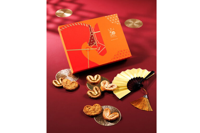 以吉祥朱紅色配以金色圓紋圖案,交疊出簡潔多樣的精緻美感,內含經典工藝研製出四季主題口味的蝴蝶酥,每片蝴蝶酥均為百分百香港新鮮製造,設有單一口味(9件裝)以及雜錦口味(15件裝)可供選擇,其中最熱賣的荔枝紅茶口味,土窯柴燒的荔枝乾清香撲鼻,配合濃郁香醇的紅茶一同研磨成細碎作為內餡,帶來豐富獨特的茶之體驗。