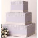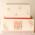 結婚的日子充滿喜悅,真的很想跟親友們分享這份幸福,一個設計可愛、滿載層層甜蜜的結婚蛋糕定可為婚宴帶來更多歡欣。如左圖柔和的紫色三層結婚蛋糕,配上淡粉紅色的絲帶,再在每層四方形蛋糕的邊緣上貼上仿珍珠的白點圓點,滲透優雅與溫柔。另一款迎合中式喜慶的結婚蛋糕亦別具特色,四方形的蛋糕只有兩層高,兩層之間以紅色的cream作點綴,加上「囍」字及中式的花紋,令本來屬於西式的蛋糕,頓時加入了中式的色彩,很適合擺中式喜宴的新人。