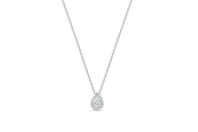 My First De Beers系列是為喜愛簡約風格的人士所打造,而這款吊墜是花式切割鑽石的完美入門之選,Aura設計以圍繞著單鑽的一圈密釘鑲鑽為特色,在這款鑽石項鍊以纖巧的形式呈現,簡潔的造型讓梨形鑽石成為該款項鍊的焦點所在。
