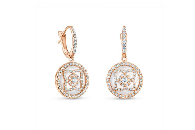 蓮花一直是純潔的象徵,這款鑽石垂墜式耳環以精緻的18K玫瑰金搭配密釘鑲鑽線條,圓形明亮式切割主鑽為中心,四枚花瓣向外綻開,每枚花瓣的輪廓都以密釘鑲鑽點綴。底座使用閃耀的白色珍珠貝母製作,整個圓形圖案由密釘鑲鑽圍繞,並垂懸於玫瑰金密釘鑲鑽圓環之下。