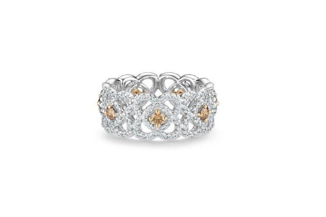 這款彩鑽戒指靈感源自蓮花出淤泥而不染的純潔之美,戒指重現了綻放的蓮花,每朵蓮花中心爪式鑲嵌圓形明亮式切割彩鑽,周圍飾有白金密釘鑲鑽和鏤空設計花瓣,戒指總共使用多達301顆圓形明亮式鑽石,鑽石總重約1.21克拉。
