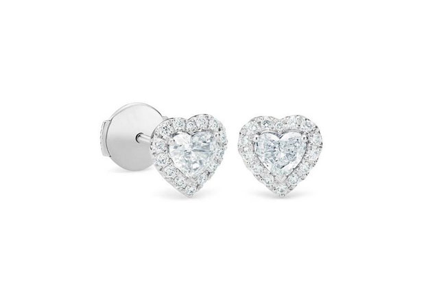這對耳釘以兩顆成對的心形切割鑽石打造,中央主鑽與外圈的密鑲鑽石相映生輝,散發著女性氣質與浪漫魅力。