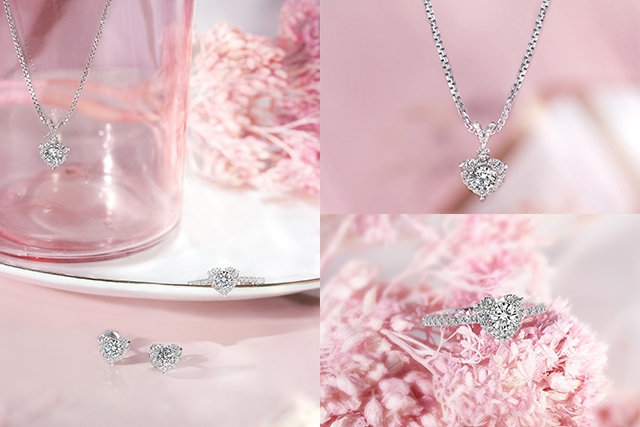 心形鑽石象徵愛情,除了是愛的宣言,更是女生最喜愛的款式之一。這款心形鑽飾套裝採用了精湛的群鑲工藝,將閃耀動人的主石幻化成一顆真心,讓女生猶如時刻被滿滿的愛包圍,喜歡心形鑽飾的女生就最適合不過了!