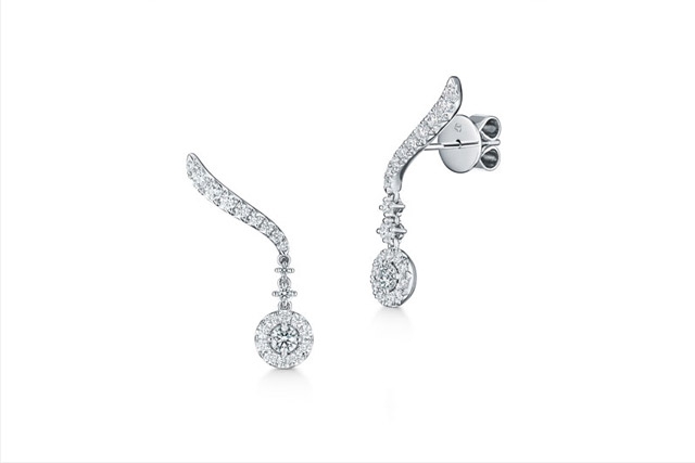 耳環的設計嫵媚動人,沿著耳廓增添一抹優美鑽光,最後配以一顆搖曳生姿的精緻鑽石,互相輝映。