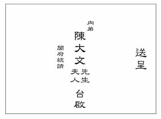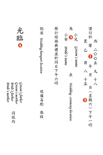 在新人名字上面,會加上在家中的排行,例如 「小女」、「長兒」等,但要小心男和女是分開計算的,新郎的姊妹不計算在內,新娘的兄弟不計算在內。