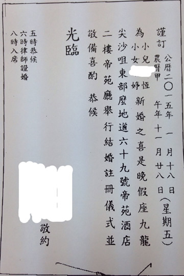 如同一天舉行證婚及婚宴,就會有三個時間出現在囍帖上。