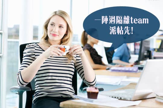 同隔離team平時有合作開,但撇開工作,平日頂多是hi bye friend,咁啱見到傾幾句,微波爐排隊叮飯先見到,咁不如唔好請。當然,為打好關係,扮世界friend,新娘都派下餅卡分享喜悅。