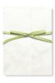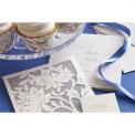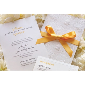 如右圖的邀請卡,白色信封上加壓了立體的花紋,純白色加上這些花紋,令人聯想起她的婚紗;在信封面上繫上柔和橙色的絲帶,簡單但優雅,相信收的朋友,一定能感受婚嫁的味道。而另一張邀請卡,就以粉藍色為主調,在上面加上有花紋圖案的法式lace,予人典雅、溫柔的感覺,配上天空般的藍色絲帶,藍白二色相襯非常討好。The Vera Wang Collection 婚禮邀請卡在本港暫未有售。